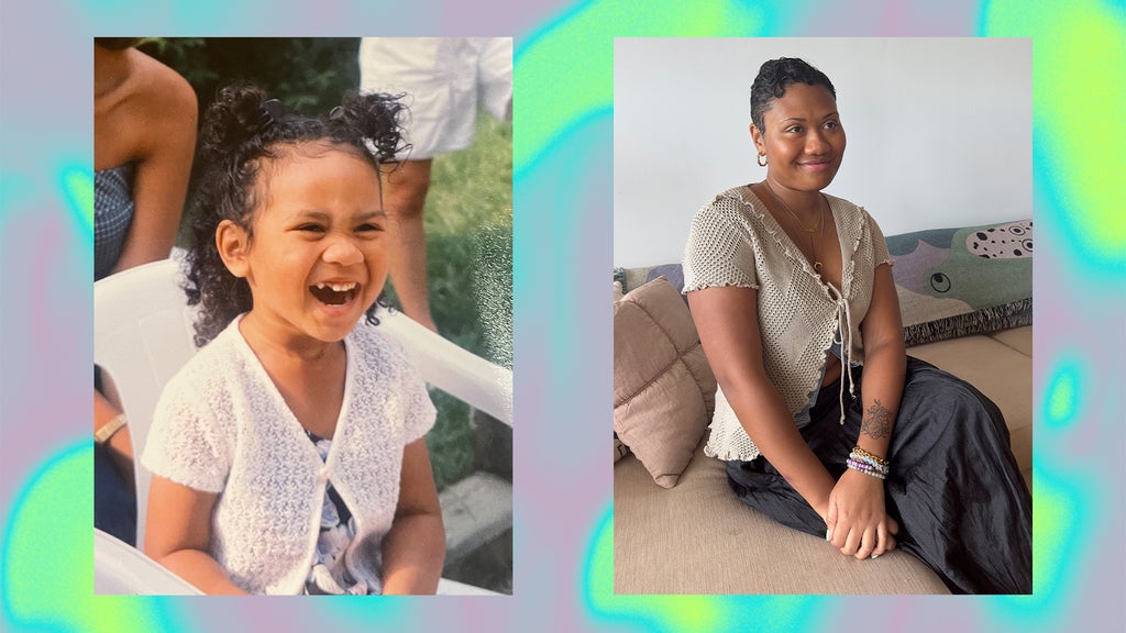 I first started gravitating towards fashion that reminded me of my childhood about a year ago — my brother had just died and it was a dark period of my life. Scrolling just to feel something, I bought myself a cropped purple tank top with a butterfly graphic, which would have otherwise been too girly or kitsch for me at the time. What I can see now is that this style of top (aka a sartorial symbol of early ’00s girlhood) strongly resembled many of the tops I loved as a child, and that gave me a distant but familiar sense of warmth.