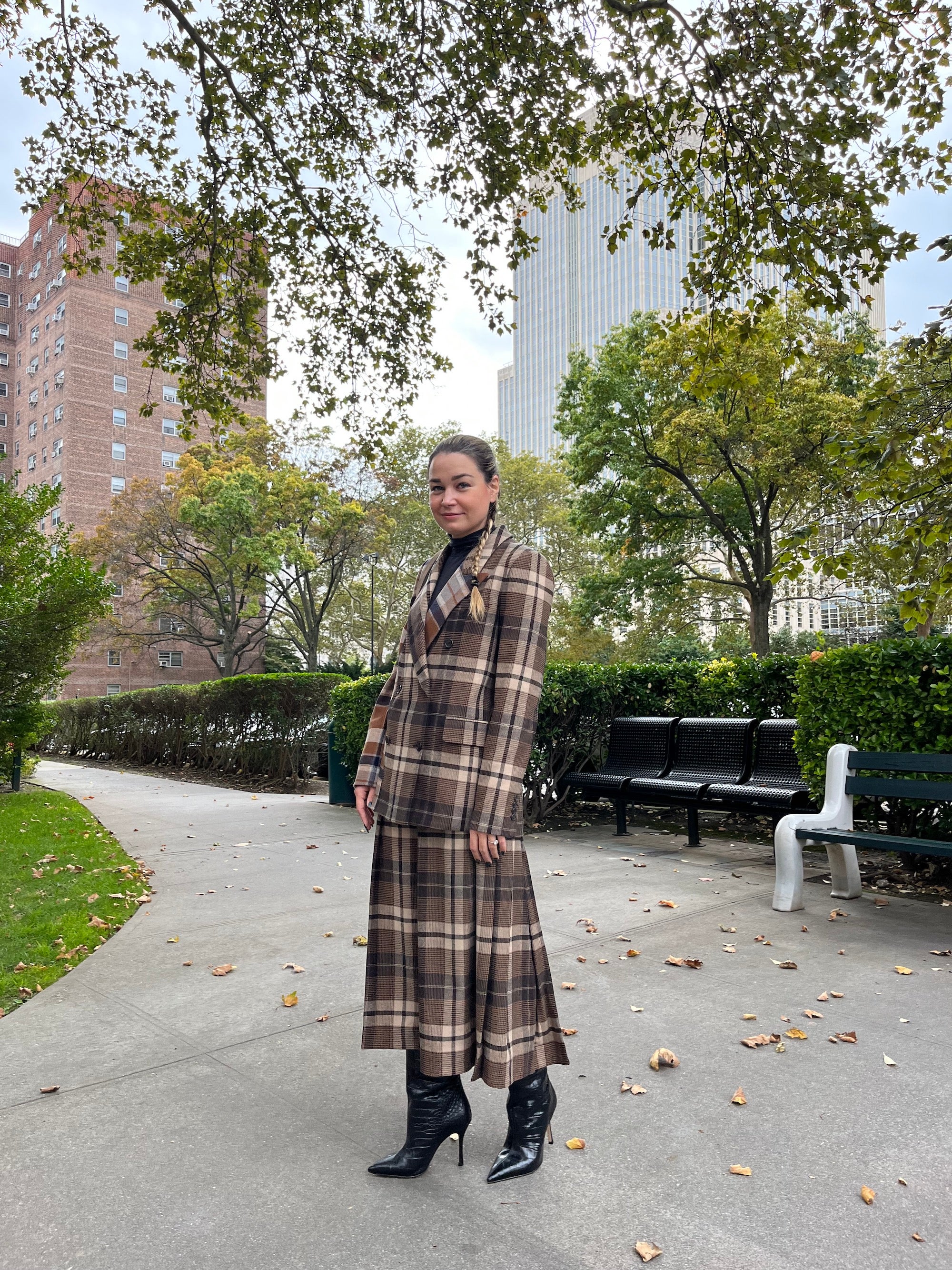 “I’ve been on the hunt for a good skirt suit for a while. Just in time for fall, I got my hands on this plaid number from Argent, the brand known for its hot pink pantsuits worn by celebrities like Kerry Washington and Sophia Bush. The fabric is thick enough to be worn on its own on a warm-ish fall day but thin enough to be layered under coats and jackets later this winter. I also love that the midi skirt features side slits that allow a peek at the shoes.” — Irina Grechko, Fashion Director