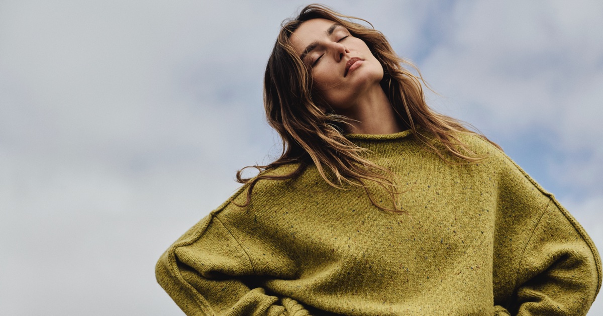 The vibe is pure autumn escapism. There are windswept fields, rustic textures, and a sense of quiet strength. The styling leans into oversized proportions and tactile fabrics, where cozy alpaca sweaters, belted wool coats, and corduroy pants ground the looks. They are set against rugged landscapes and weathered backdrops.