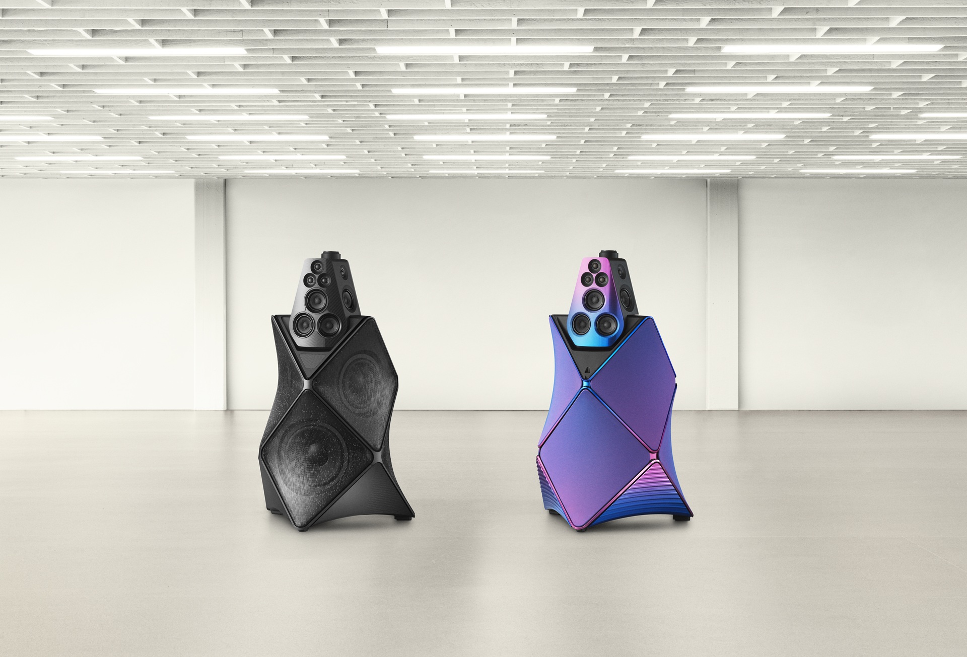 The Mirage Edition, meanwhile, moves in the opposite direction. Instead of stealth, it embraces colour, and lots of it. The iridescent fabric covering shifts between sapphire and magenta, echoing sound waves whenever light hits the surface. Five aluminium components on each speaker undergo bespoke gradient anodisation, paired with wave-textured surfaces that give the entire structure a sense of movement.