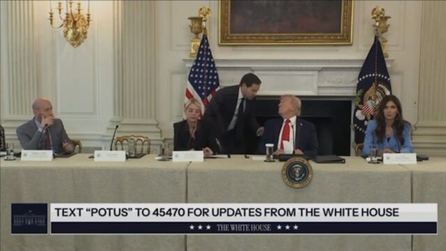 During a roundtable event earlier on Wednesday, Secretary of State Marco Rubio arrived mid-event, and he passed a note to President Trump, which read, “Very close. We need you to approve a Truth Social post soon so you can announce deal first.”