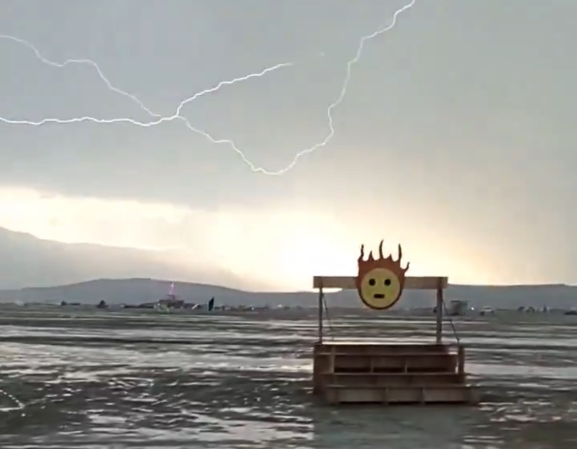 BURNING MAN 2025 – Tuesday August 26, 2025 645pm. We have water on playa. Heavy rain, wind, lightning and thunder but no dust!!!! Lots of rain. Wait till you see the lighting in the video! Illumination village @ 2 and Esplanade #burningman #swimmingman2025 #burningman2025… pic.twitter.com/RTEksmwBim