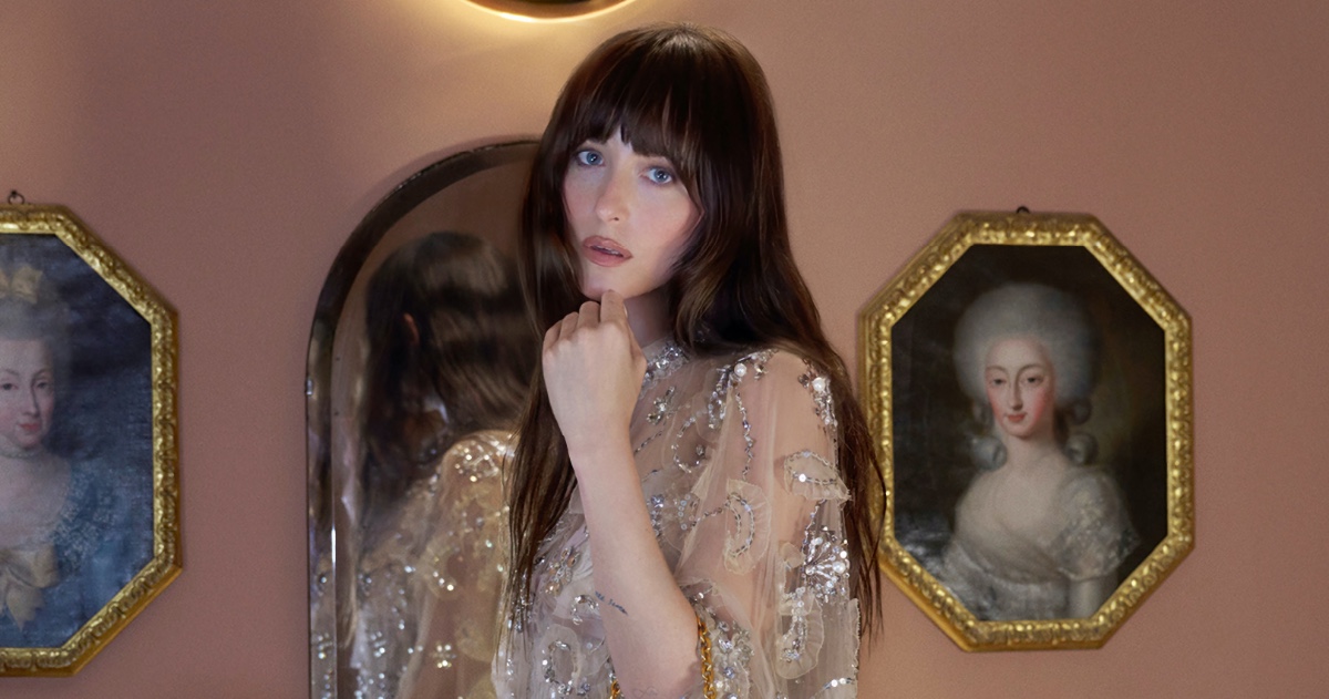 Dakota Johnson lounges in scarlet chiffon, phone in hand, while Tate McRae glides through doorways in Valentino red. Marisa Berenson, Anne Imhof, Dev Hynes, and Devon Teuscher complete this surreal cast.