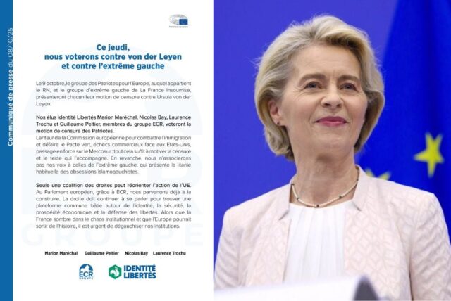 Our Identité Libertés MEPs Marion Maréchal, Nicolas Bay, Laurence Trochu, and Guillaume Peltier, members of the ECR group, will vote for the Patriots for Europe censure motion to combat mass immigration and dismantle the European Commission, which has succumbed to trade deals with the United States, imposed the Green Deal, and forced the Mercosur agreement. These are sufficient reasons to justify the censure, along with the accompanying text. However, we will not join our voices with those of the extreme left, which presents the usual litany of their Islamo-leftist obsessions.