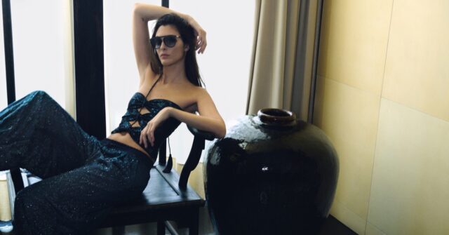 Standout looks include a charcoal-grey power suit with a giant floral lapel and a shimmering, sequined evening gown that is classic Armani. Because Vittoria has been an Armani face before, her presence feels natural and enduring.