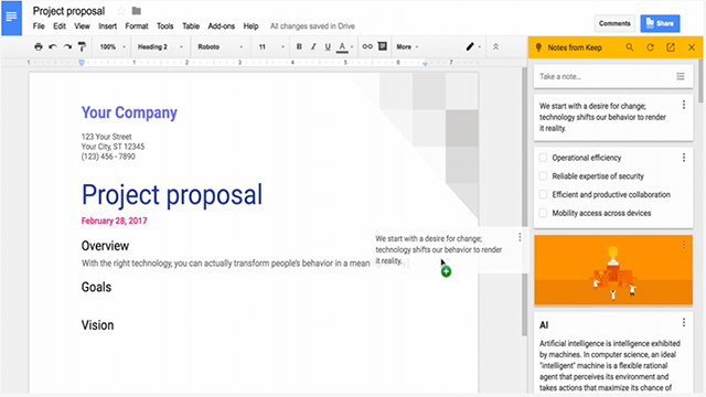 Now that it’s part of G-Suite, Keep appears in the tools section at the side of each document. You can search through notes from there, find the information you require and drag it straight into a Google Doc.