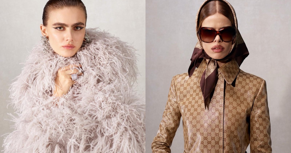 The images spotlight strong styling and iconic details. One model wears a rich burgundy blouse with a tied bow at the neck, finished with bold gold GG jewelry. Another look brings drama with a cloud-like feathered coat that feels pure fashion fantasy.