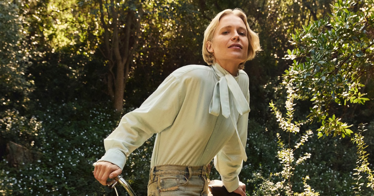 Models Steffi Cook and Woosang Kim move through blooming gardens and forest trails with a carefree energy. Styled by Marq Rise, the looks balance softness with ease. A pale mint blouse with a long neck tie. Relaxed, distressed wide-leg denim.