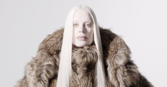 Her icy platinum hair, styled by Hyungsun Ju, flows dramatically over sharply tailored looks. The vibe is modern and fierce. From oversized pinstriped blazers to sculptural denim and a dramatic faux fur coat, each outfit pushes the limits of shape and proportion.