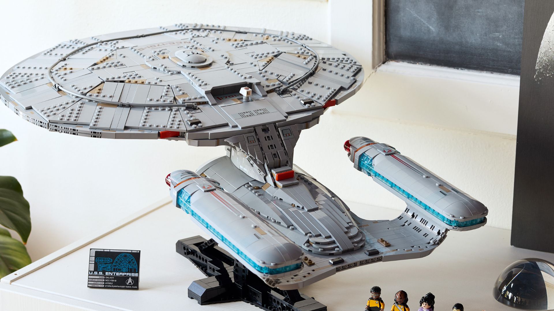 It sits on an angled display stand with a collector’s plaque listing the ship’s launch details and construction site – just the sort of nerdy precision Star Trek fans will appreciate.