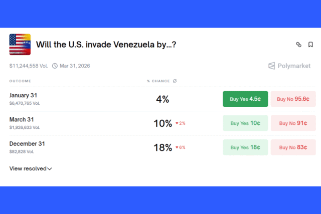 A total of $10.5 million has been wagered on the Polymarket contract predicting a US invasion of Venezuela. Most of these are on the deadline of January 31, while the rest are based on contracts that end in March and December.