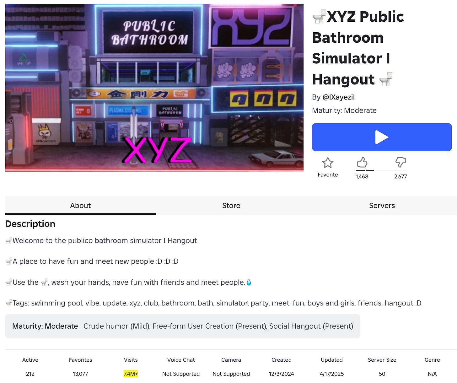 A horrific example is XYZ Public Bathroom Simulator, a game where it is commonplace to see naked avatars (predators) showering with kids.