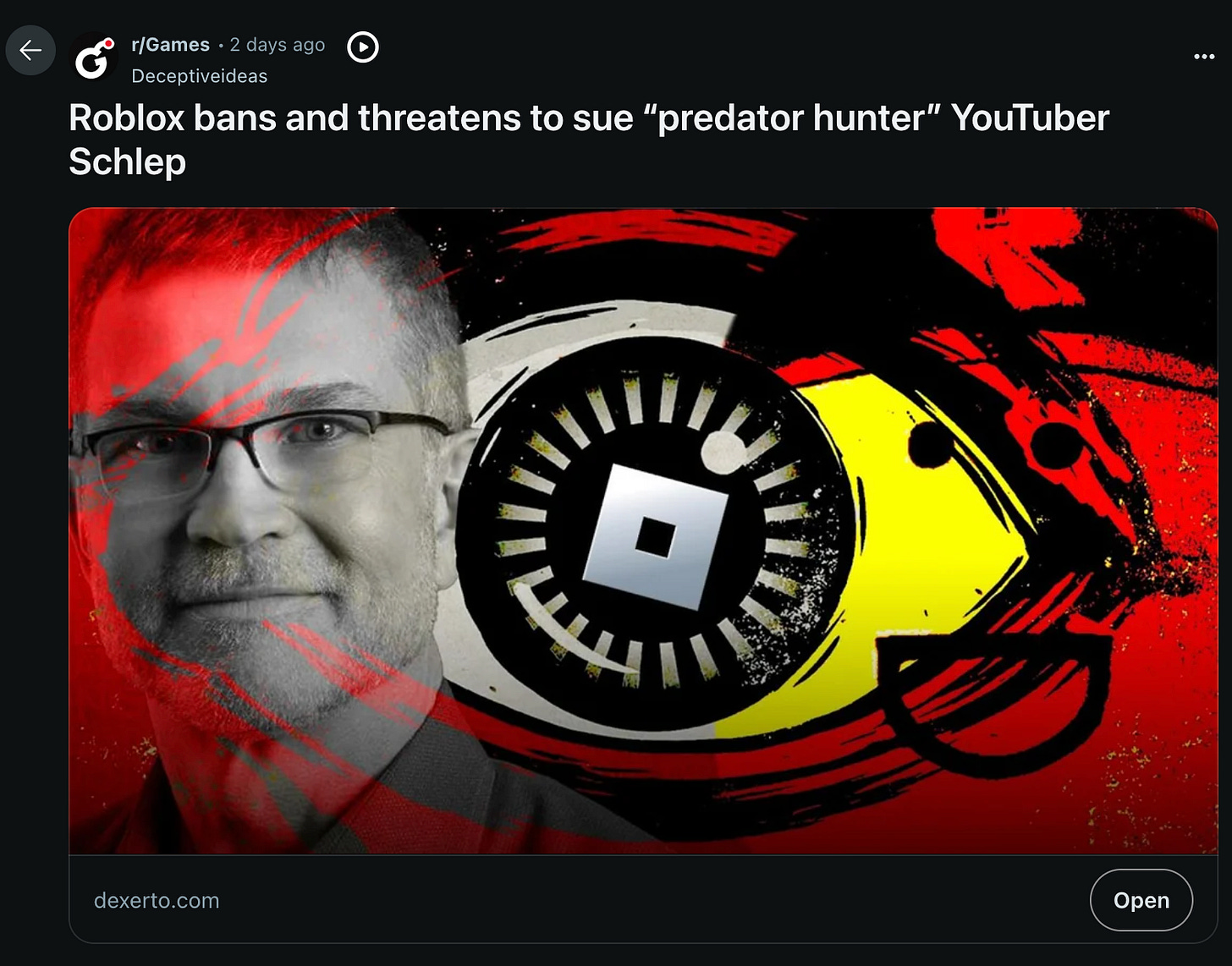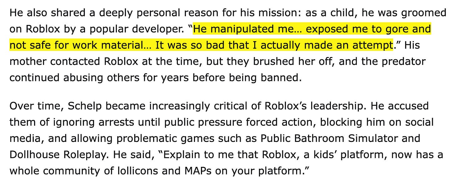 “History has proven again and again [that] it’s infinitely easier for corporations to silence and censor whistleblowers than actually work on fixing whatever issue they’re bringing attention to. Roblox doesn’t have a child predator issue if no one’s able to report on it. The fact [that] his [Schlep’s] investigations led to six actual arrests made by the police acting on outside evidence is proof enough his efforts aren’t misguided.”