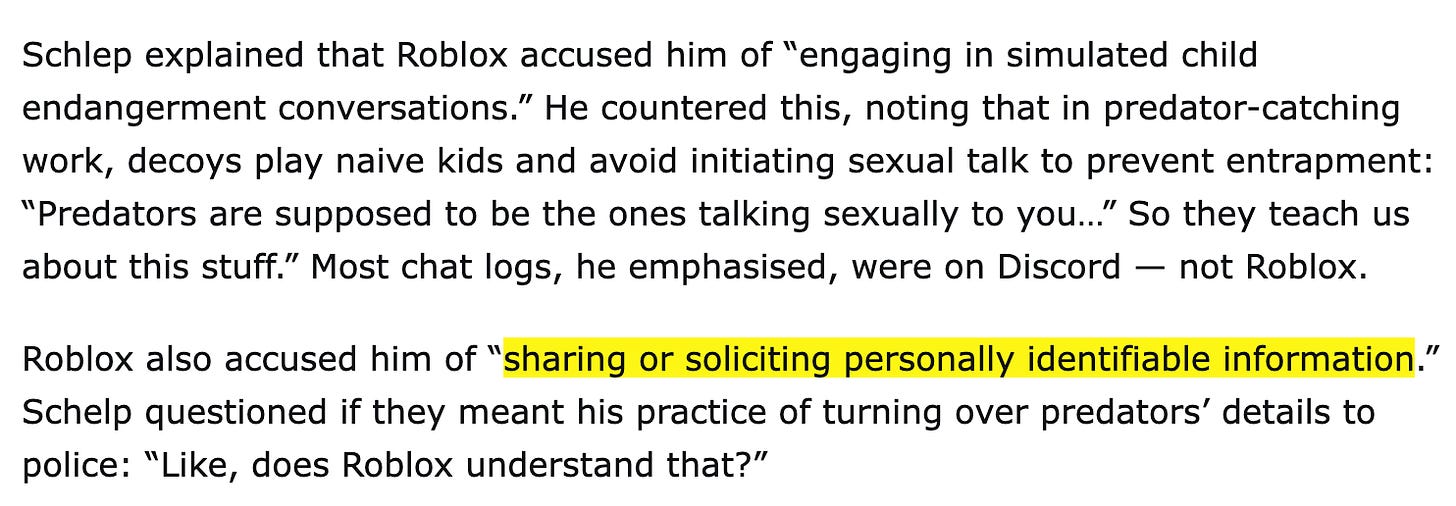 Schlep was gobsmacked and wondered if Roblox was referring to the practice of turning over the information of predators to police. “Like, does Roblox understand that?” he asked.