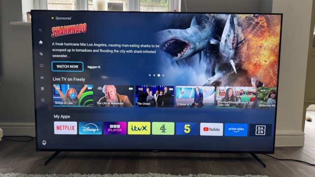 The screen is illuminated with regular big ol’ LEDs rather than Mini LEDs, and there’s no Quantum Dot colour system to boost the range of colours either.