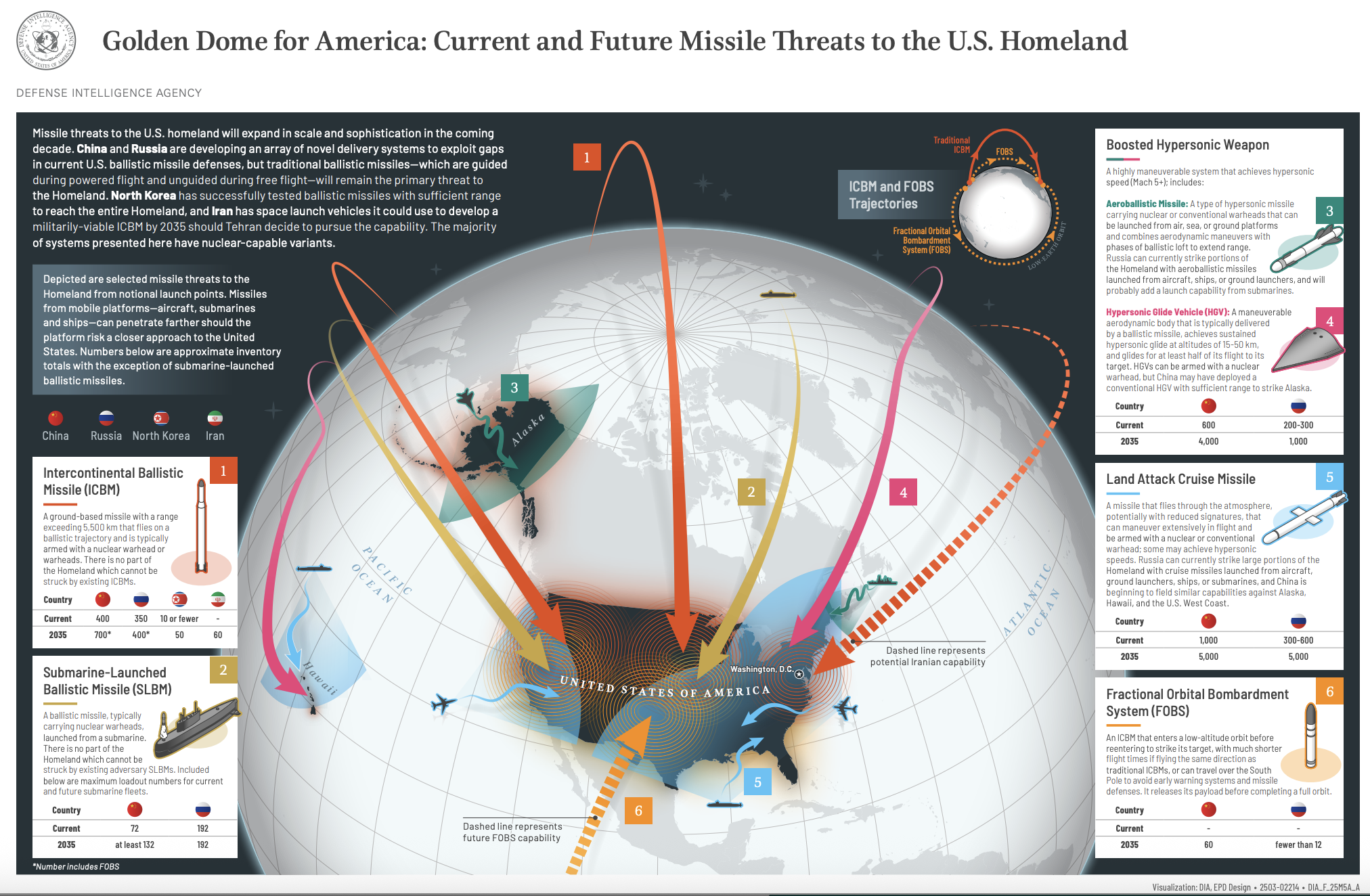 In some ways, “Golden Dome” will be a return to the glory days of Eisenhower’s Nike Plan only this time, more reliable, higher levels of effectiveness, and perhaps not as noticeable. “Golden Dome” will be a layered defense of missiles, cannon, electronic warfare, and lasers defending dozens of America’s cities, ports, airfields, factories, and sensitive strategic sites. Some of these capabilities will be on the ground and some may be in orbit like the Star Wars concept of operation. Sensors such as radars, electro-optics, heat, and motion sensors will be linked to regional and national command centers to conduct engagement decisioning with advanced Artificial Intelligence at cyber speed.