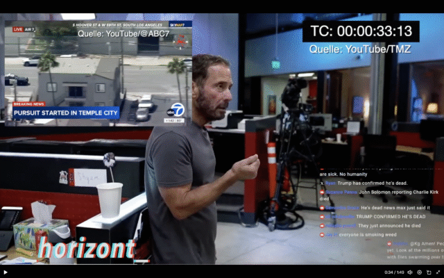 German X user Hori_zont cross-edited the TMZ livecast with the ABC car chase footage, showing it is highly unlikely the TMZ staff were cheering the car chase, just as the news came in in that two-time father and American hero Charlie Kirk had succumbed to his fatal gunshot wound.
