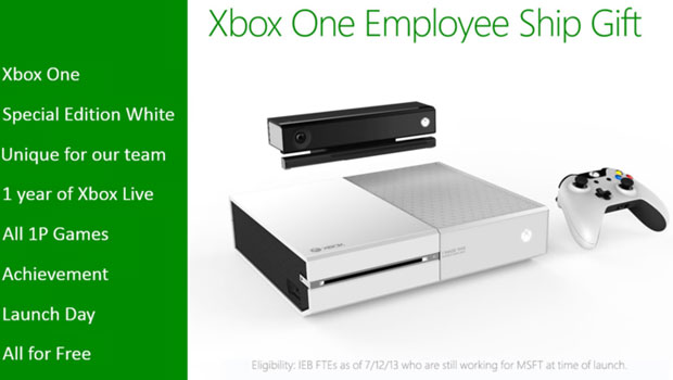 Entitled the “Xbox One Employee Ship Gift,” the white Xbox One will reportedly come with a raft of additional goodies, with the “Special Edition white [console] unique for our team” to be further bolstered by a year’s complimentary subscription to Xbox Live, all first party Xbox One games, and a special achievement.”