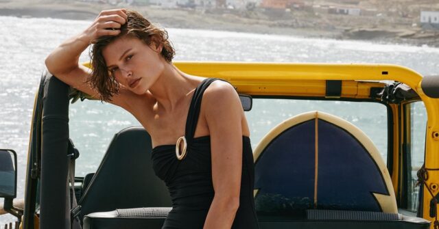 Model Bibi Breslin fronts the editorial, shot against the ocean in images that feel sun-drenched and effortlessly cool. The accessories are kept minimal with just sunglasses and sandals, letting the swimwear do exactly what it’s supposed to do.